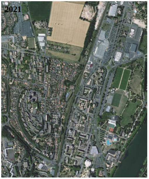 Il faut attendre les années 1995 à 2005 pour voir oser se continuer l’expansion, avec la zone commerciale et artisanale autour du centre E. Leclerc, à la frontière avec Sancé, en parallèle du développement du complexe Auchan en contrebas. Il ne restera plus qu’à gratter les quelques surfaces escarpées de la Déserte, vers là aussi en 2021 l’inexistence d’espaces verts.