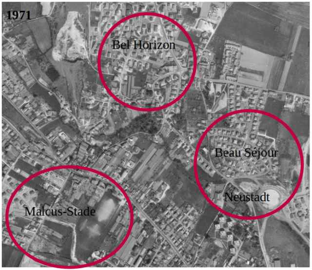 Autour du bourg, on voit le développement de Beau Séjour (1960-1965), l’explosion de Bel Horizon et Malcus (1965-1971), avec également dans cette période l’installation du stade et du rond-point de Neustadt, auquel succède le boulevard Victor Schoelcher (1971-1976). On investit ensuite les pentes de la Grisière, on installe les Sorbiers (1976-1985), avec alors déjà des espaces libres et verts qui sont quasiment inexistants [1].